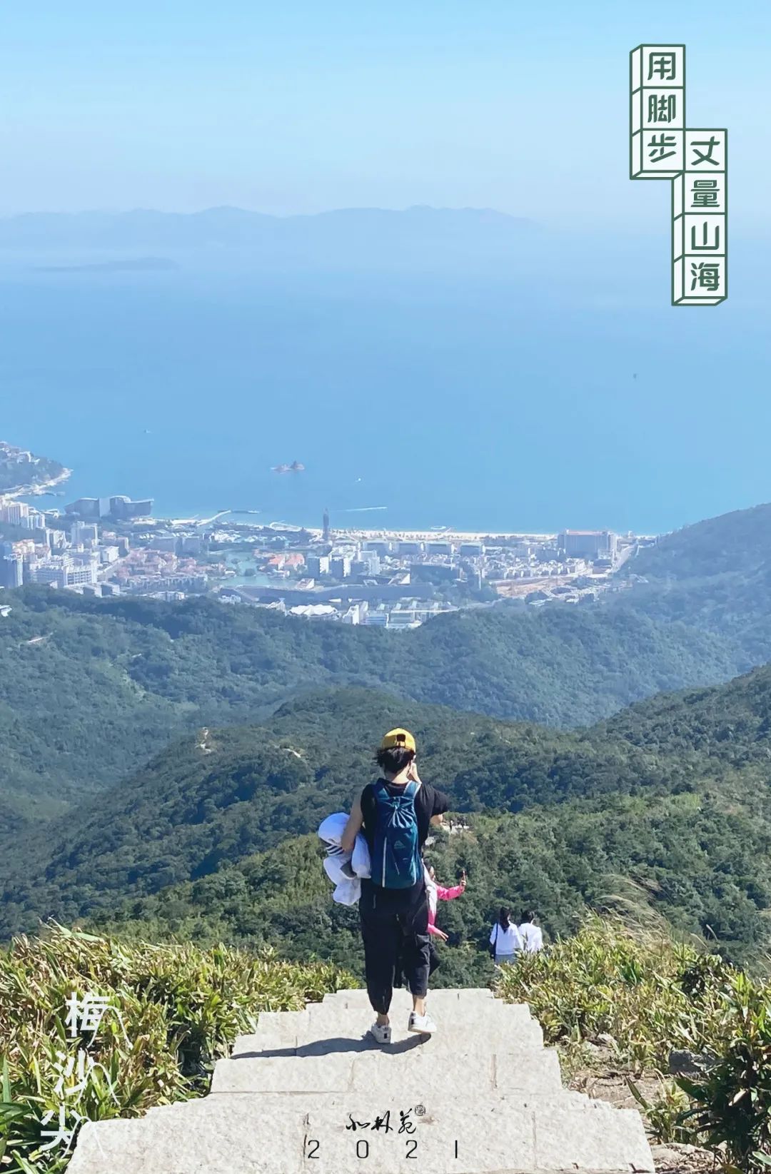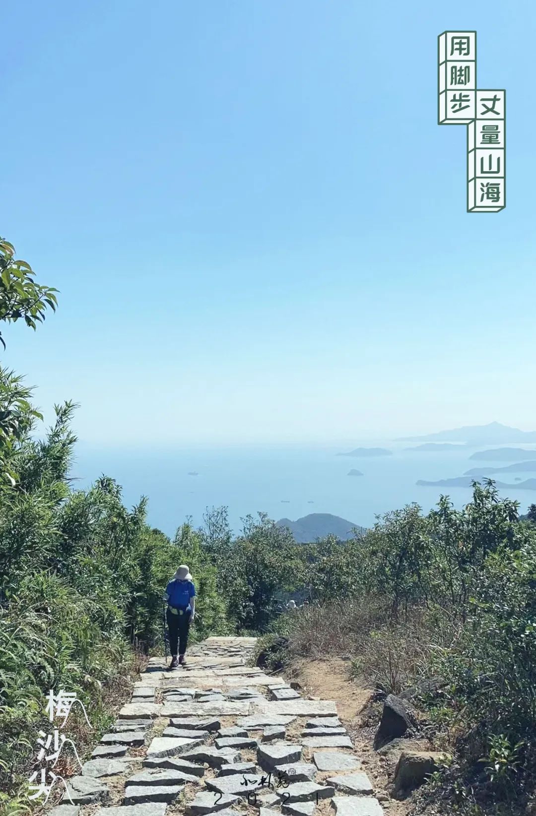 從公園登山口出發,走主峰科考線到達山頂。這條由北林苑設計的風景絕美的山海徑在遵循生態保護、旅游優先、集約利用等原則的前提下,根據現有海岸線及山體等自然資源,拓展綠道功能,創造性地融合了防火道、護林道、登山道、救援道、林業科研道、景觀道六道功能。