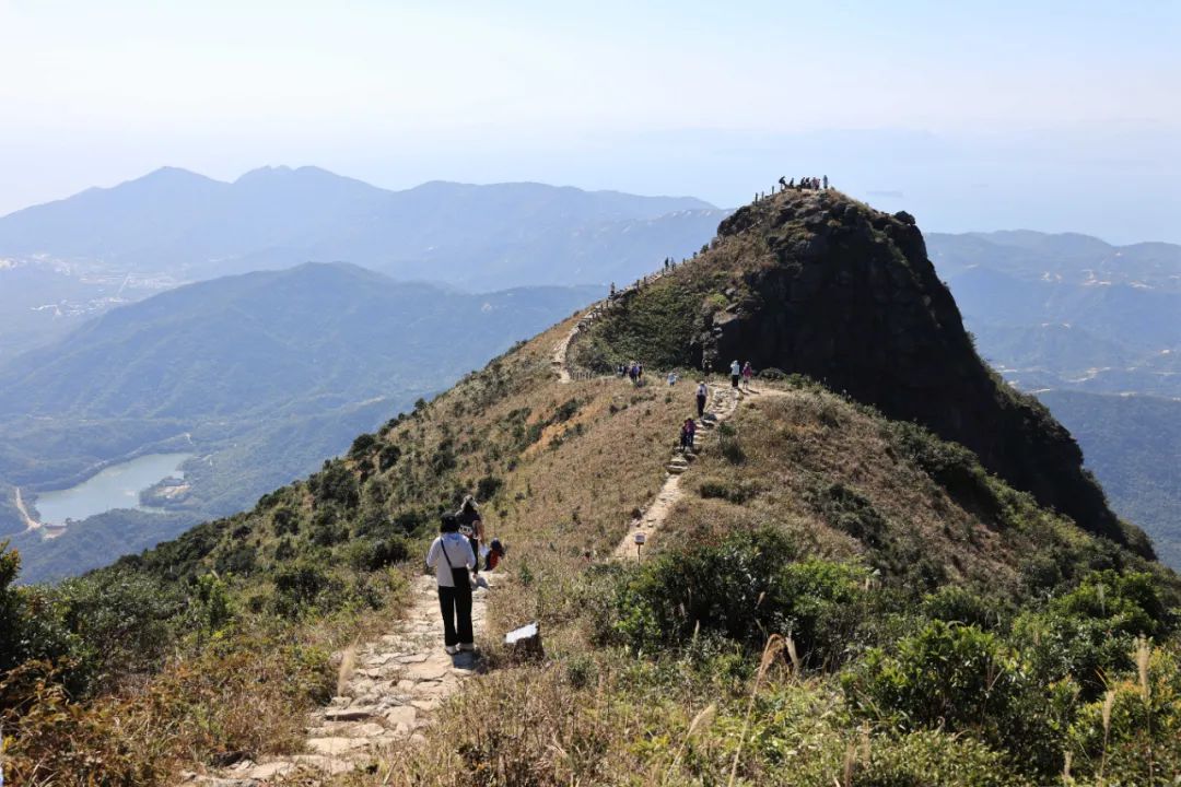 沿途的棧道、觀景平臺、涼亭、活動廣場等景觀節點,充分利用原山石、林木、山澗、海洋等自然環境,成為了極佳的網紅拍照打卡點。頂峰三面環海,草甸遍布,可近觀火山熔巖痕跡,可遠眺大雁頂、排牙山、大鵬灣、楊梅坑、東西涌、三門島、大小甲島等,超五星的270度無敵海景,隨手一拍,每一幀都是手機壁紙。